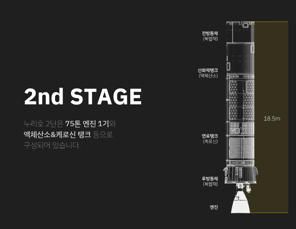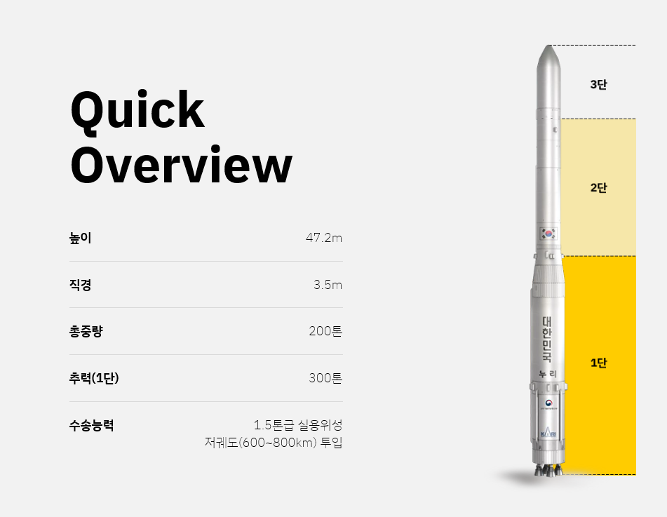 누리호는 높이 47.2m, 직경 3.5m, 총중량 200톤, 추력(1단)300톤, 1.5톤 실용위성이며 지구 저궤도 (600~800km)에 올려 놓을 수 있는 우주발사체 입니다.
