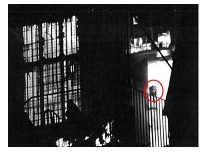 정체는 사진을 정밀분석해 본 결과 천장에 인형을 실로 묶고 장난친것으로 확인됨.