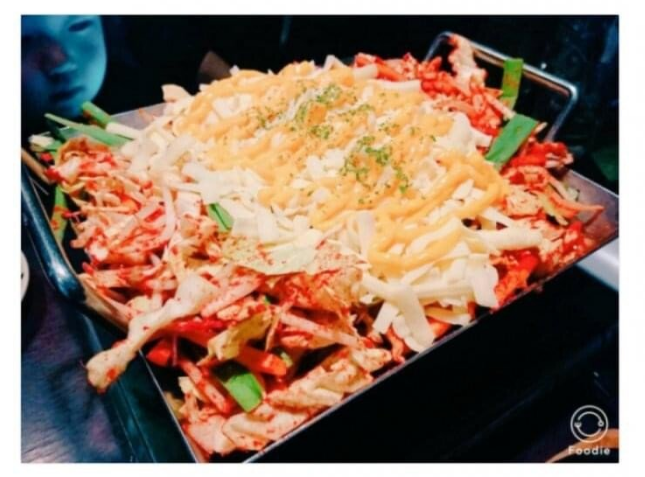 요리 사진이 맛있게 찍히는 어플을 사용의 결과로 어플의 색조보정으로 뒤에 있는 아이의 얼굴이 귀신처럼 나옴
